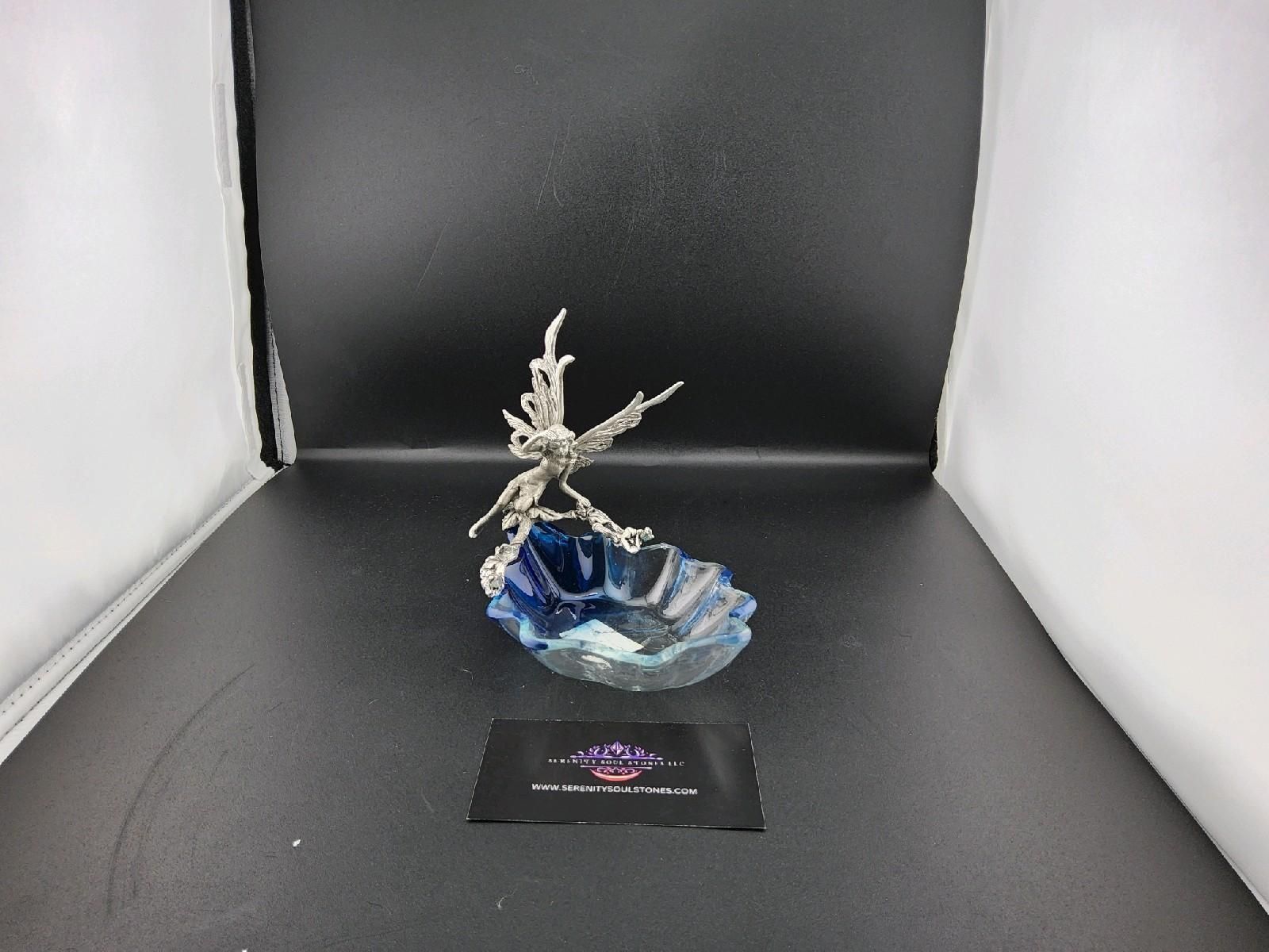 Bring delicate charm to your décor with this Exhausted Pewter Fairy Figurine featuring a blue glass accent. Expertly crafted from pewter, this decorative piece depicts a resting fairy with detailed wings and flowing design elements. The translucent blue glass adds a soft pop of color and contrast, making it a beautiful addition to shelves, desks, or display cabinets. Perfect for collectors and anyone who appreciates elegant fantasy-inspired décor