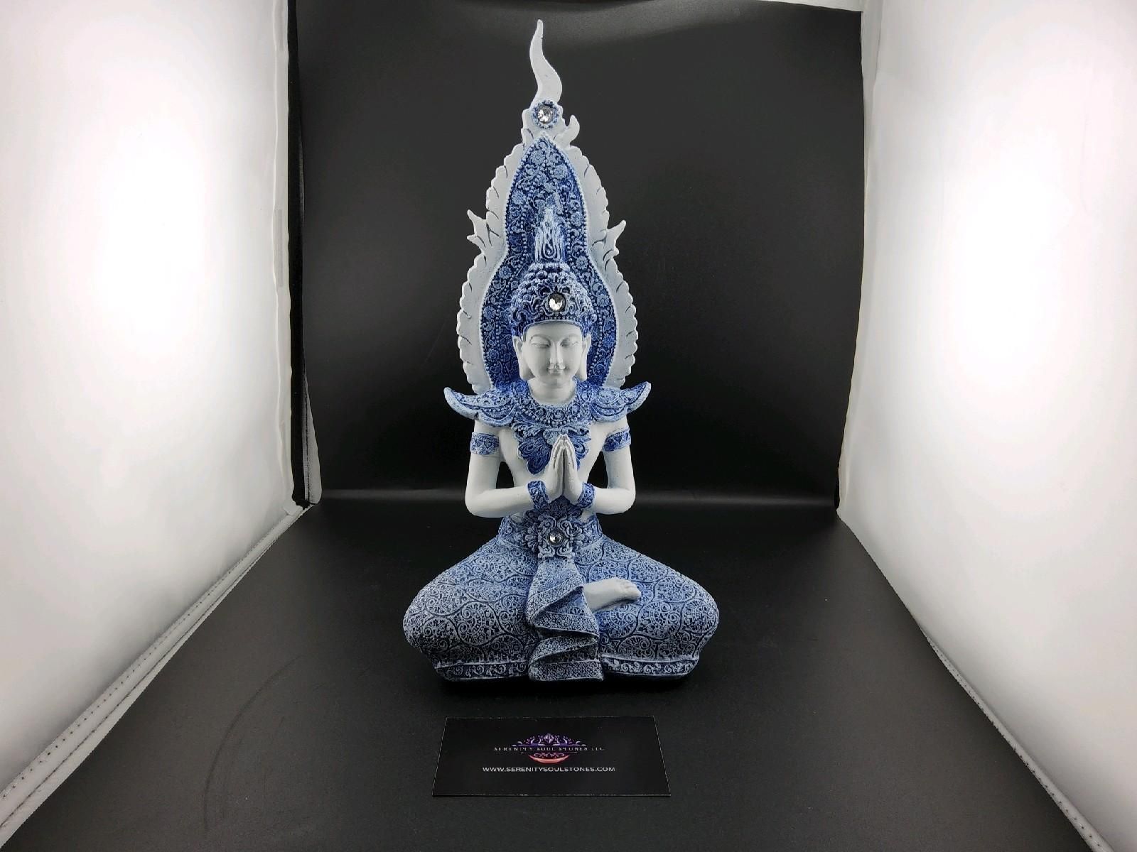 Add a peaceful accent to your décor with this 12-inch Praying Buddha Statue in blue and white tones. Crafted from durable resin with a smooth painted finish, this decorative figure features fine detailing and a serene design that complements a variety of home styles. Perfect for shelves, tables, or display spaces, it brings an elegant and calming visual presence to any room. Suitable for indoor decorative use.